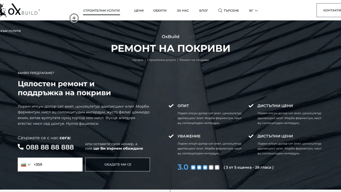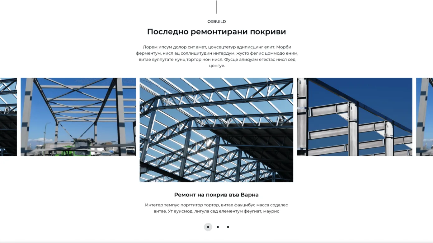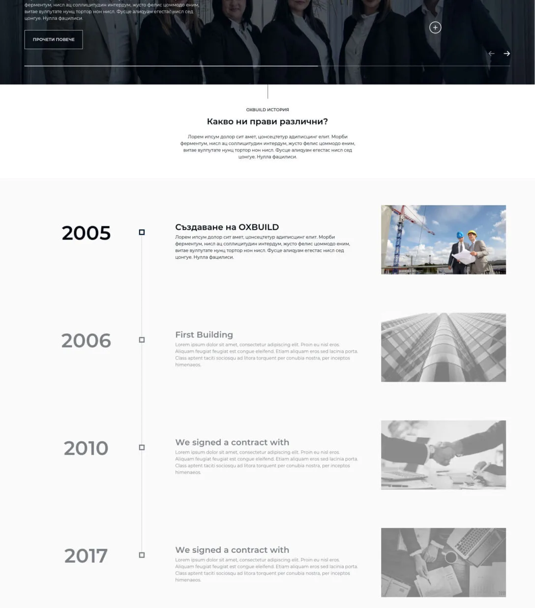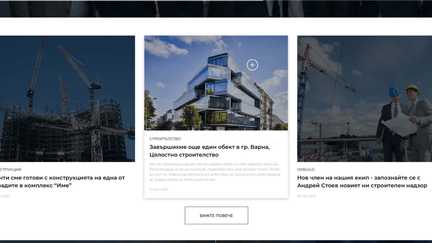 OXBUILD е една от успешните компании със свързана дейност, които формират мащабен холдинг. Има над 20 годишен опит в областта на строителството и всички свързани с него допълнителни услуги. Компанията се развива еднакво успешно като строителен инвеститор и доставчик на услуги и материали през годините. Предлага широко разнообразие от услуги, които позволяват на купувачите на нови жилища да се насладят на новия си завършен дом, без стреса на довършителните дейности и ремонтите. OXBUILD ни възложи изработката на сложен като конструкция и фокус на вниманието корпоративен уеб сайт.