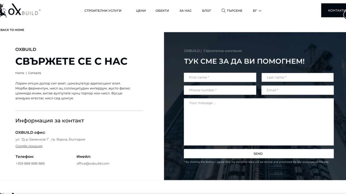 Интегрирана е активна карта с местоположение на офиса на OXBUILD с препратка към Google Maps.