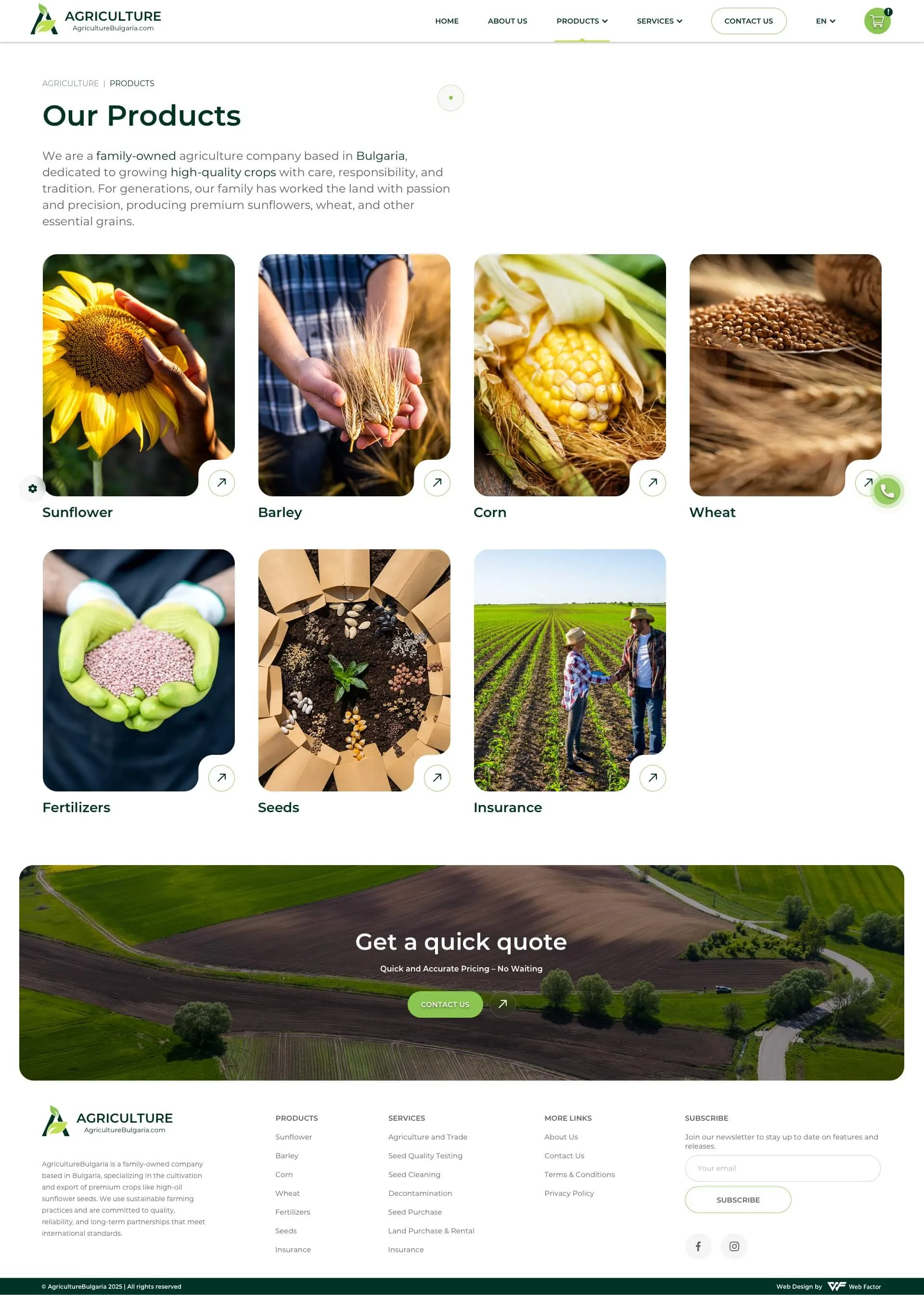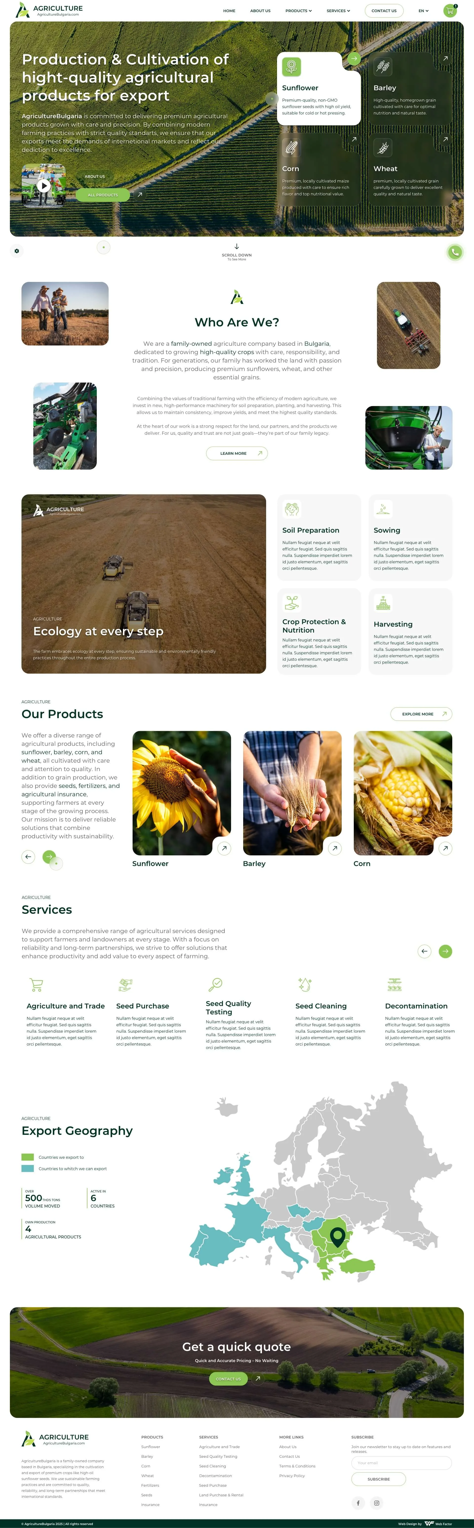 AgricultureBulgaria е българска компания, специализирана в производството и отглеждането на висококачествени селскостопански продукти за износ. Комбинираме модерни земеделски практики, устойчиви технологии и дългогодишен опит, за да осигурим премиум качество на международните пазари.