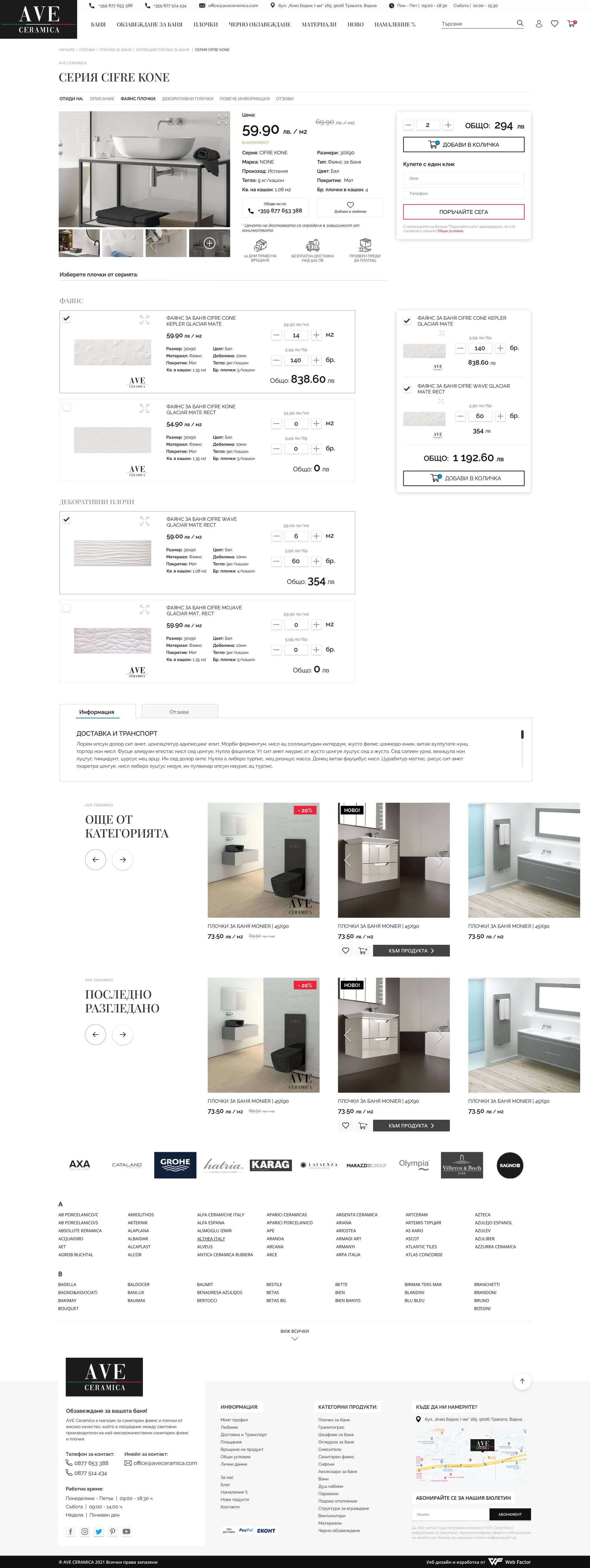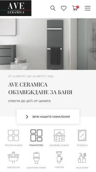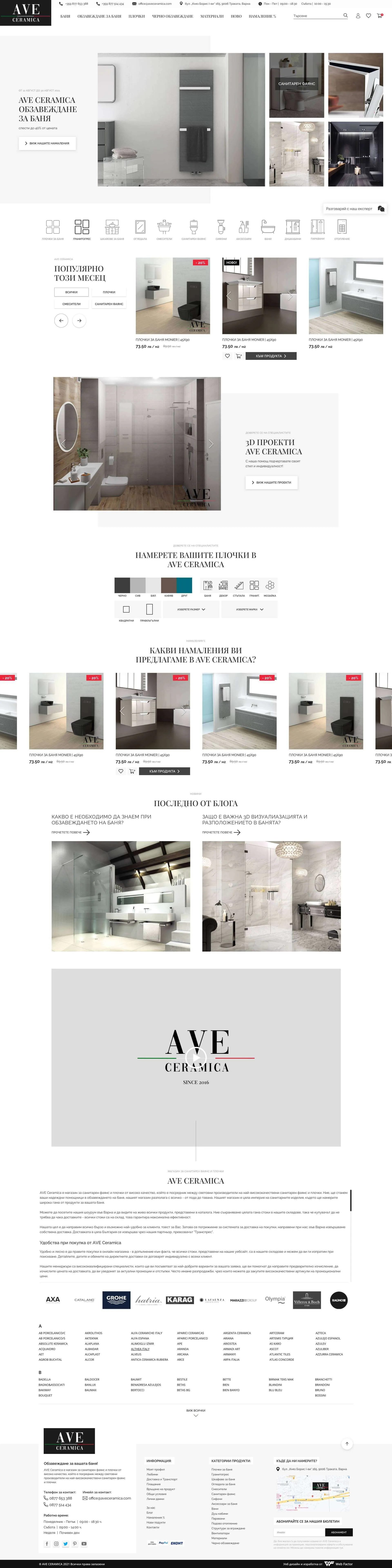 Уеб сайтът на Ave Ceramica е пътят към перфектната баня! Нашата цел е да представим най-новите продукти, вдъхновения и решения за модерната баня. С богата гама от 3D проекти, гранитогрес, плочки и аксесоари, сайтът предлага лесна навигация, с която да вземете правилното решение за обзавеждане на баня. Ще откриете продукти на известни и доказани марки