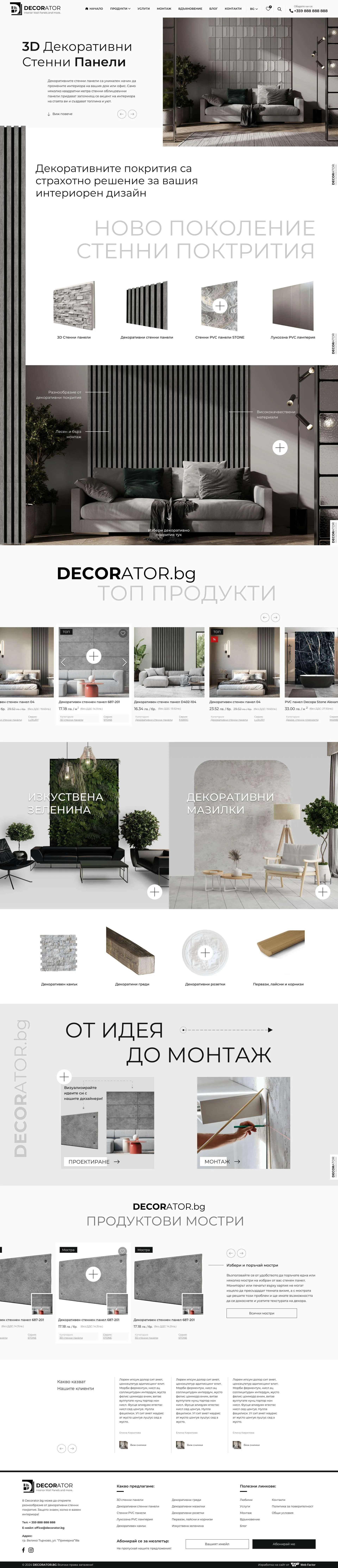 Decorator.bg е специализиран онлайн магазин, предлагащ широка гама от декоративни решения за стени и интериор. Платформата представя разнообразие от 3D стенни панели, декоративни камъни, мазилки, PVC ламперии и изкуствени зеленина, съчетавайки функционалност и естетика.