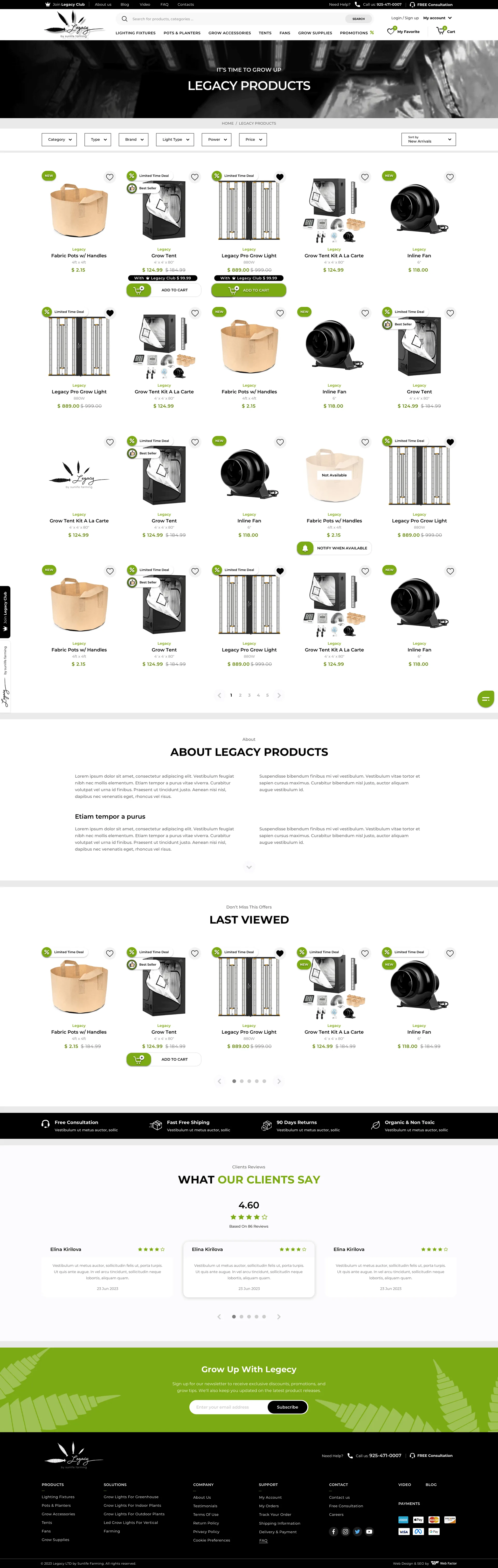 Legacy By Sunlife е онлайн магазин за LED осветителни тела за отглеждане на култури и цветя, както и аксесоари и продукти за тях. Създадохме уебсайт с модерен дизайн и лесна навигация, който предлага качествени изображения и подробна информация. Целта на сайта е да бъде полезен на всички фермери, които желаят да увеличат добива си и търсят разнообразни продукти и аксесоари.
