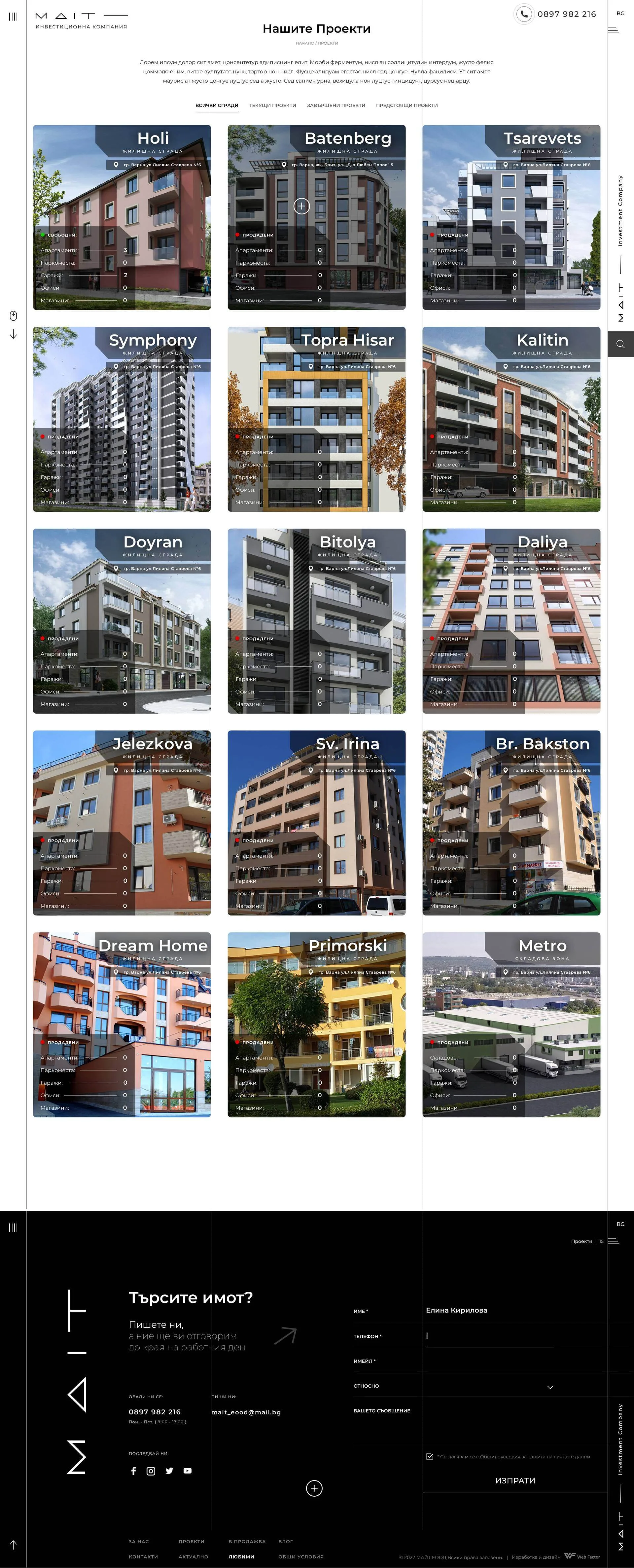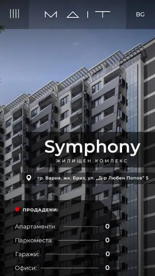 В уеб сайта получавате възможност да разгледате текущи проекти и да намерите свободните обекти в продажба. Чрез нашата интерактивна карта на сградите, можете лесно да разгледате характеристиките и разположението на апартаментите и паркоместата в продажба. С инвестиционна компания Майт можете да откриете вашето мечтано жилище.