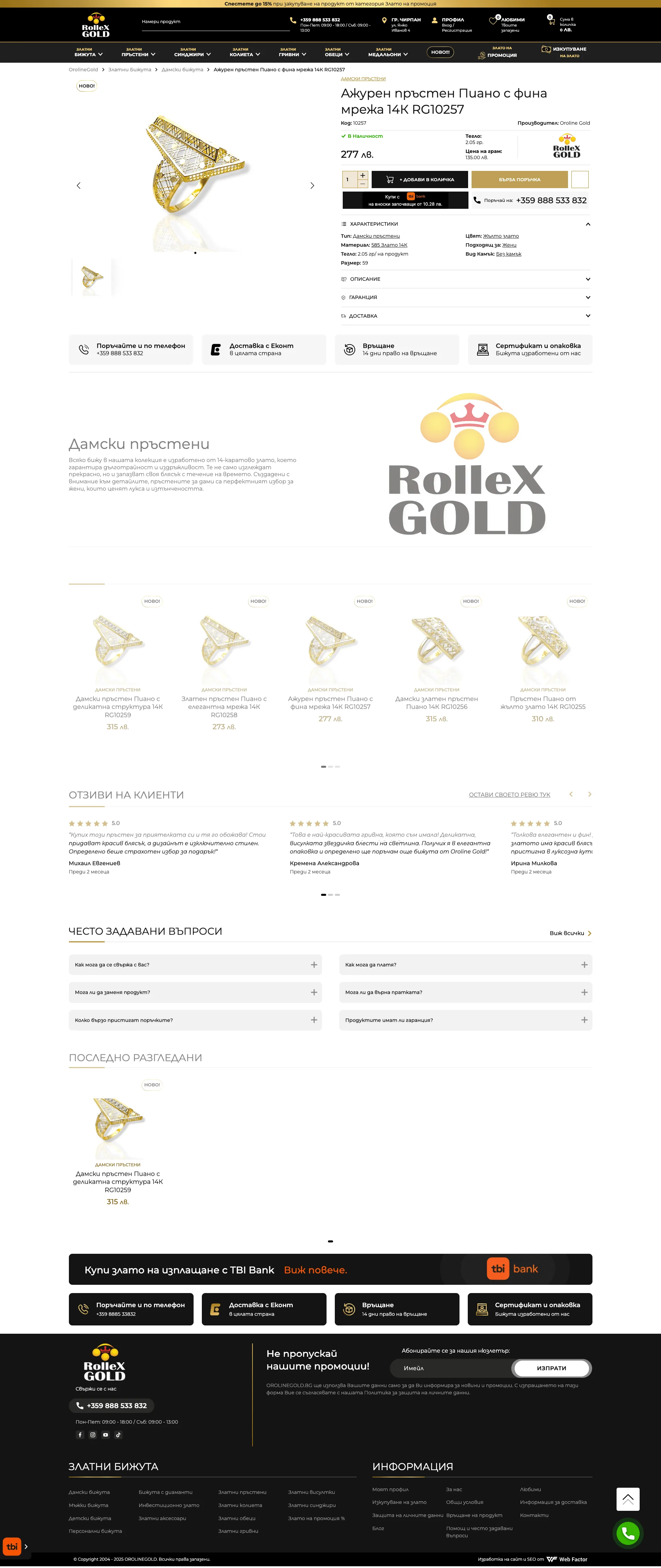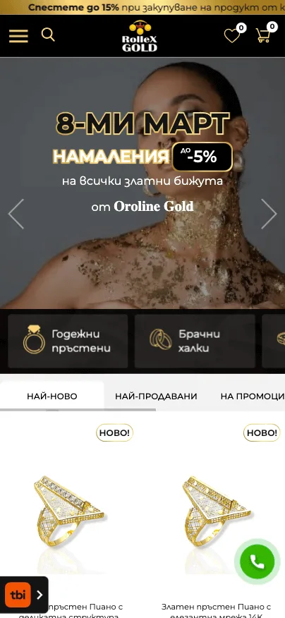 Oroline Gold или Rollex Gold е онлайн магазин с традиции стартирал през 2004-та година. Бижутата им са невероятни, от 10 000 модела златни бижута 5 000 изработват сами - по свой дизайн и на място в работилницата си. Собственика и екипа за онлайн магазина са абсолютно невероятни - правят всичко, за да осигурят най-доброто обслужване и най-качествените бижута за своите клиенти. Златните бижута се продават както онлайн, така и на място в Чирпан. Собственика на Оролайн Голд не е просто сертифициран търговец на злато, а второ поколение златар. Може да Ви даде най-добрите съвети за избора на златни бижута или инвестиция в злато. Постарахме се да направим най-добрия онлайн магазин за продажба на златни бижута, като посрещнахме десетките специфични изисквания. Заедно постигнахме страхотен резултат!