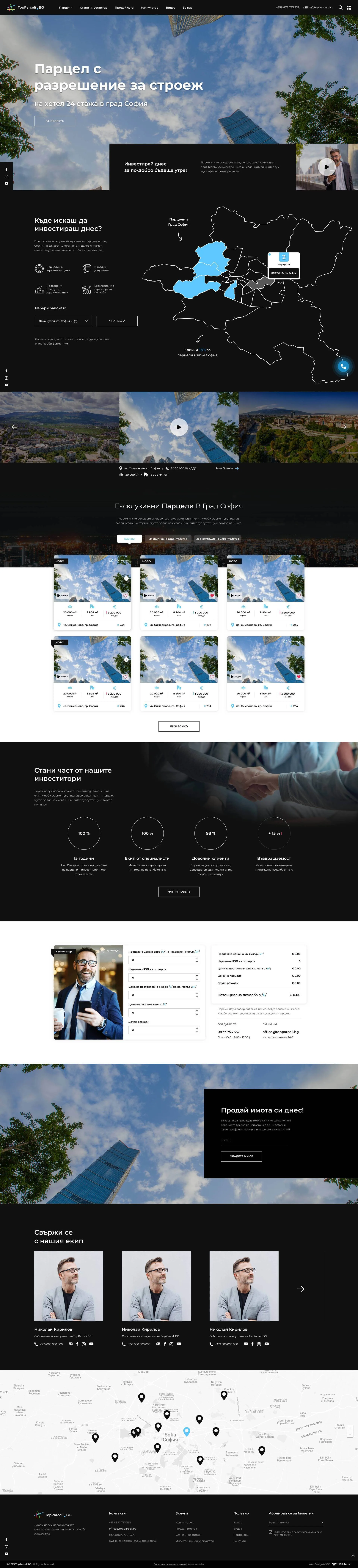 Topparceli.bg е вашият сайт към най-добрите парцели за продажба в София и околните райони. Създадената интерактивна карта ви дава възможност да разгледате свободните парцели и да изберете къде да инвестирате парите си. Чрез сайта може да продадете вашия парцел на максимално изгодна цена. Модерната визия на сайта е допълнена с необходимата информация за услугите.